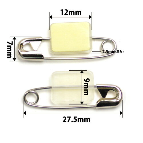 商品仕様 サイズ 全長:約27.5mm 針カバー幅:約7mm 台座:約12mm × 9mm × 2.5mm 素材 針:ステンレス 針カバー:スチール(ニッケルメッキ) 台座:アクリル 生産国 JAPAN 商品説明 貼り付けタイプの安全ピンです。