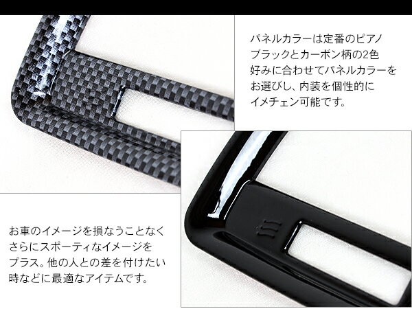 ・カーボン柄/ピアノブラックの2色をご用意、室内にさりげないワンポイントアクセント! ・ダッシュボードのエアコンの吹出し口部分に両面テープを使用しての簡単取付。